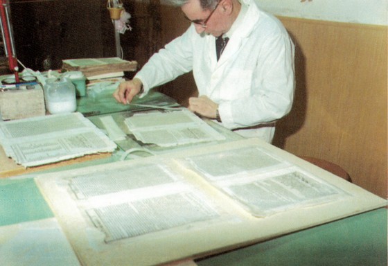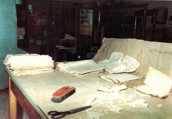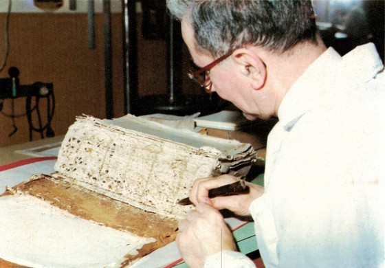Dal 1970 è stato attivato il laboratorio del restauro del libro diretto con competenza e dedizione da Don Gregorio Martin. Punto di riferimento in Sardegna ad esso si rivolgono non solo Enti ecclesiastici ma anche, e negli ultimi tempi soprattutto, archivi e biblioteche isolane e della penisola, oltre che i maggiori collezionisti privati. “Davanti a un reperto antico rosicchiato dai topi o aggredito dalla muffa, chiunque si metterebbe le mani nei capelli! Il monaco restauratore, invece con calma, davanti al problema studia la formula migliore d’intervento. Le fasi preliminari del restauro del materiale cartaceo sono la disinfestazione, l’esame delle particolarità codicologiche, la fascicolazione, l’impaginazione, la foratura e la rigatura. Si smonta e si scuce, provvedendo alla pulizia con un apposito pennello; segue il fissaggio, il lavaggio e lo sbiancamento. Quando lavare o sbiancare? Molto dipende dall’esperienza del restauratore e dall’entità del danno. La deacidificazione è il test sull’acidità della carta e degli inchiostri e può essere acquosa o alcolica, a seconda dei materiali da trattare. Il restauro vero e proprio consiste in diverse fasi: la velatura, la sutura, il risarcimento delle lacune, l’imbrachettatura e lo spianamento. Le fasi preliminari del materiale membranaceo, soprattutto la pergamena si articolano nelle seguenti fasi: la disinfestazione, la ricognizione, lo smontaggio, la scucitura. In più, occorre fare attenzione ai colori delle miniature, evitando il lavaggio e lo sbiancamento, poiché l’acqua aggredisce in maniera irreparabile la pergamena. L’ammorbidimento restituisce flessibilità alla pergamena, lo spianamento elimina le rughe e le grinze. La saldatura e i rifacimenti, soprattutto negli atti notarili ridanno nuova vita, avendo cura di individuare la direzione del dorso. Per la legatura del libro sono necessarie le assi lignee e la coperta.